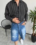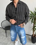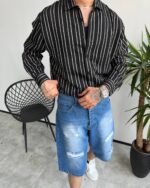 پیراهن مردانه راهراه مشکی با خط سفید | کد 5515