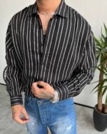 اگر به دنبال یک پیراهن لخت و سبک مردانه برای فصل گرم هستید که استایلی مینیمال و شیک ارائه دهد، این مدل دقیقاً همان چیزی است که به آن نیاز دارید. طراحی راهراه باعث میشود اندام کشیدهتر دیده شود و رنگ مشکی با خطوط سفید، استایل را تمیز و مرتب نشان میدهد.